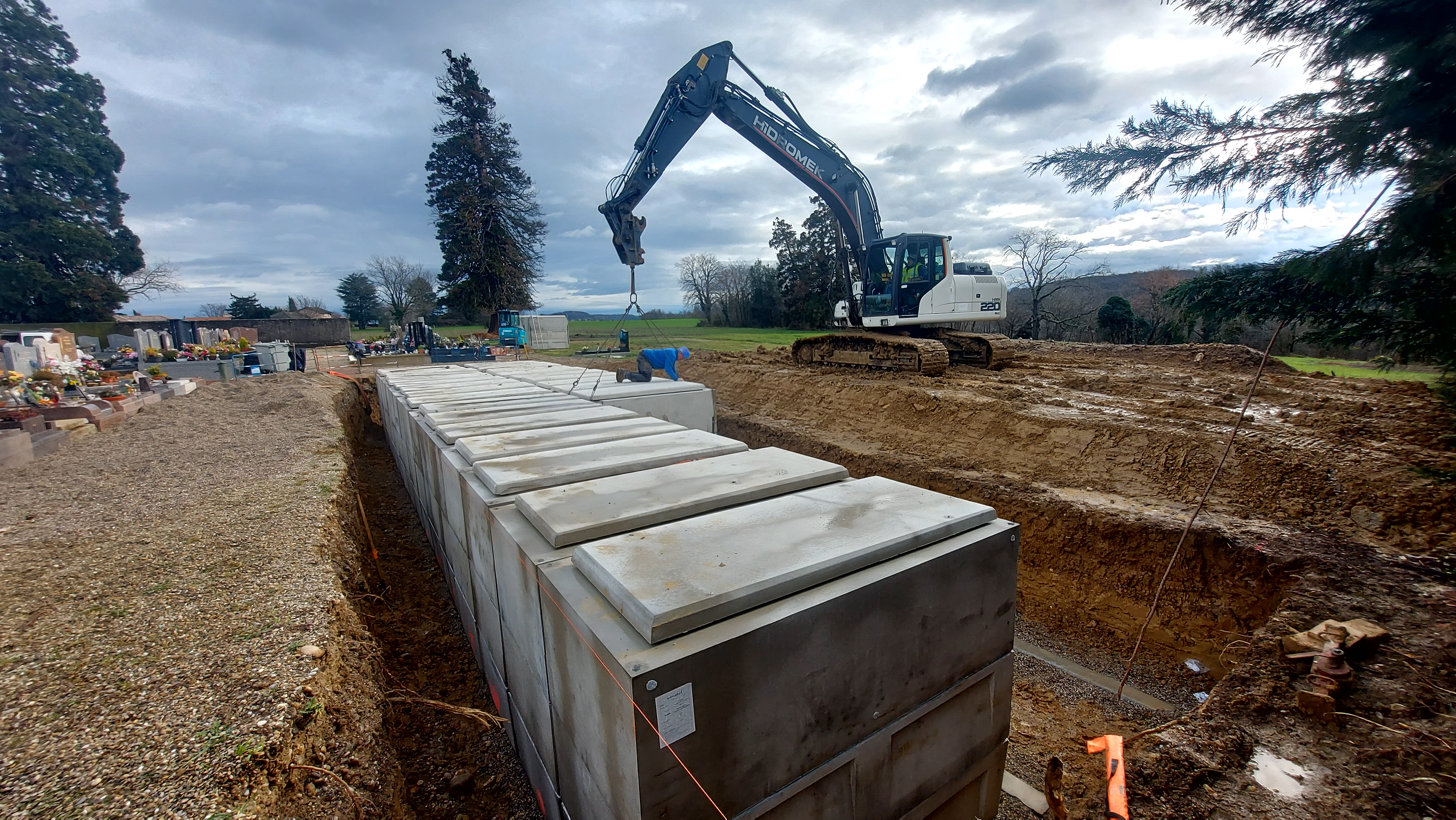 Sur fin d'année 2023, nous avons donc réalisé la fourniture et travaux de pose de 32 caveaux 3 places préassemblés (en 2 rangées de 16 caveaux) avec remise en état de l'allée existante en gravier.